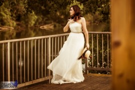 Novia en postboda asomándose en el embarcadero de Arroyo de la Encomienda