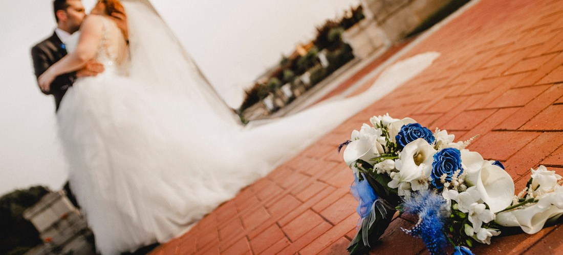 El ramo de novia, impresionante, con rosas y plumas azules, y calas blancas.